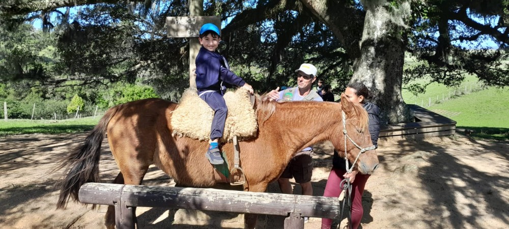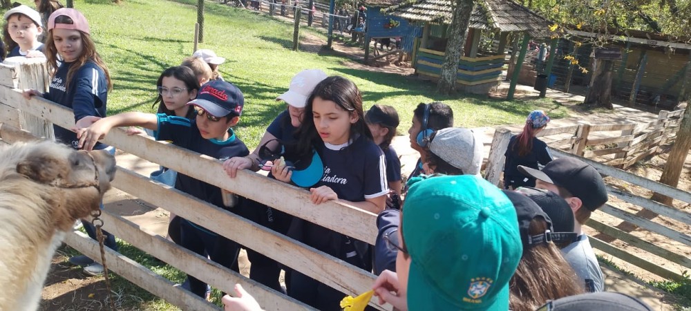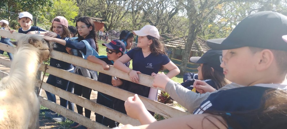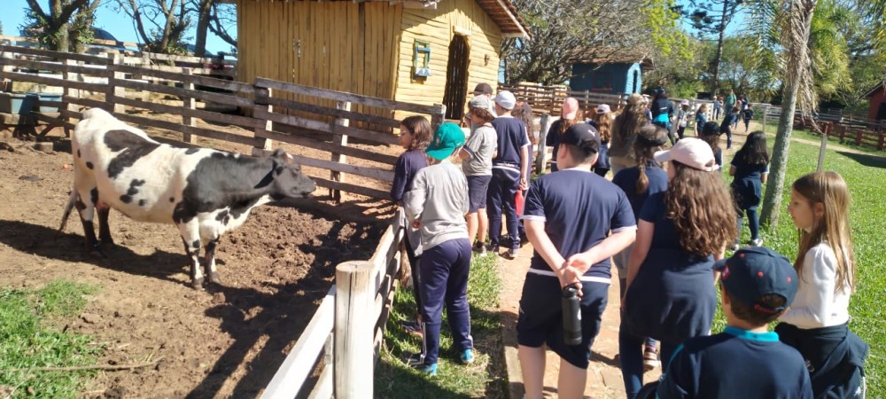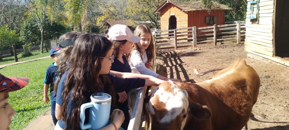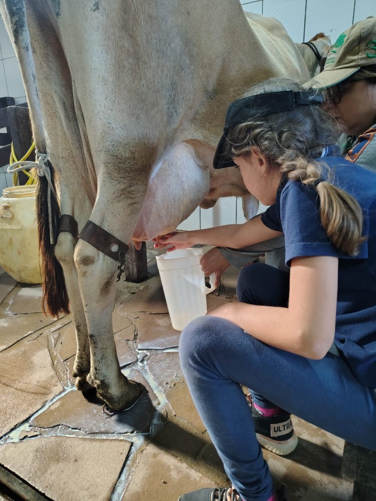 Durante a visita, os alunos exploraram diferentes aspectos da cultura gaúcha e participaram de atividades relacionadas à natureza e vivências, como tirar leite da vaca.